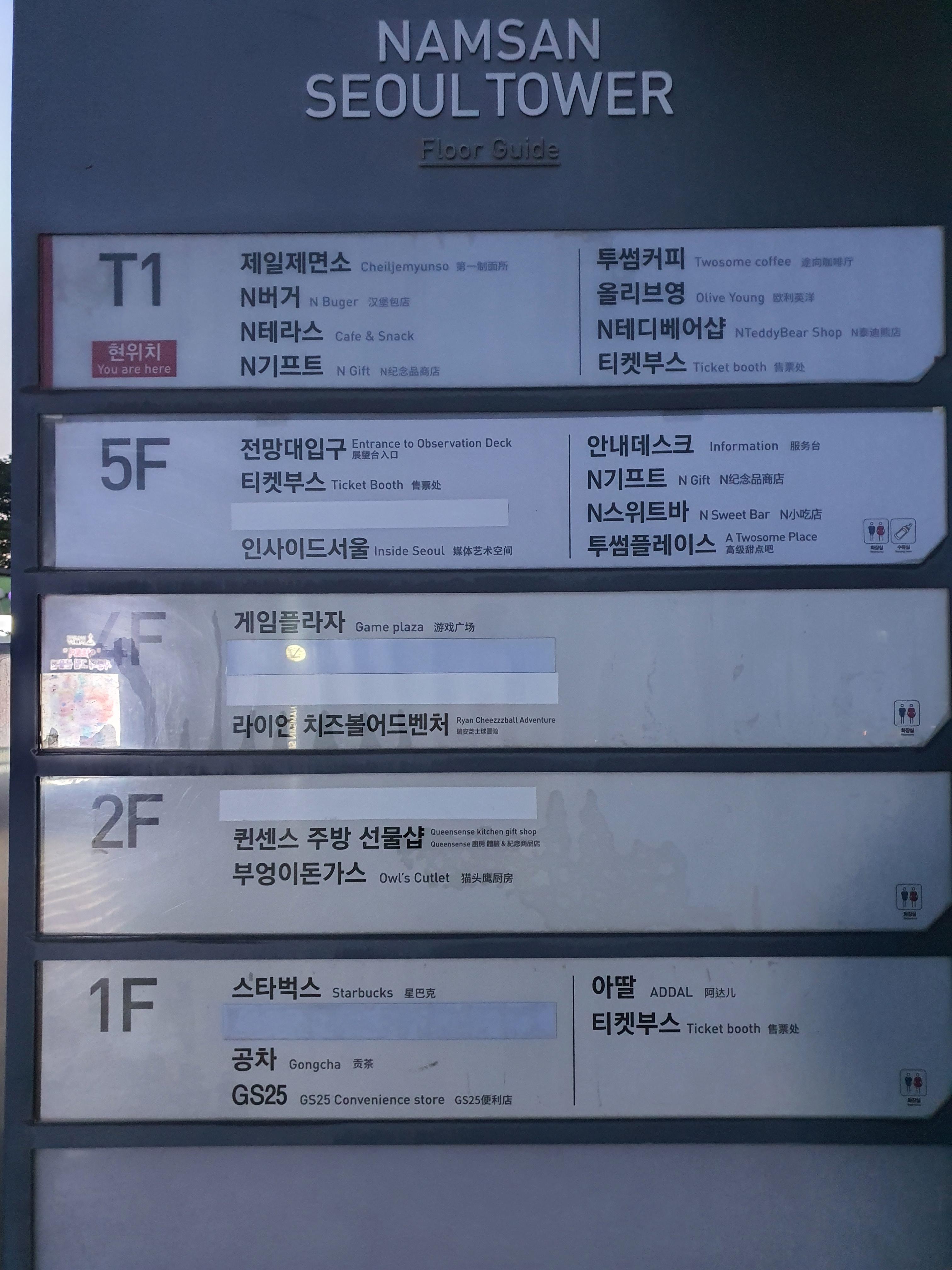 남산타워에 엘레베이터가 있는데, 계단으로 올라오면 T1(현위치)에 도착하게 된다. 남산타워에 올라가기 위해서는 한층 아래로 내려가면 된다. 나는 물이 마시고 싶어서 1층의 GS25부터 다녀왔다. 참고로 코로나 때문인지 전체적으로 6시나 8시 이후에는 상점이 정상운영하지 않는 곳이 많았다.