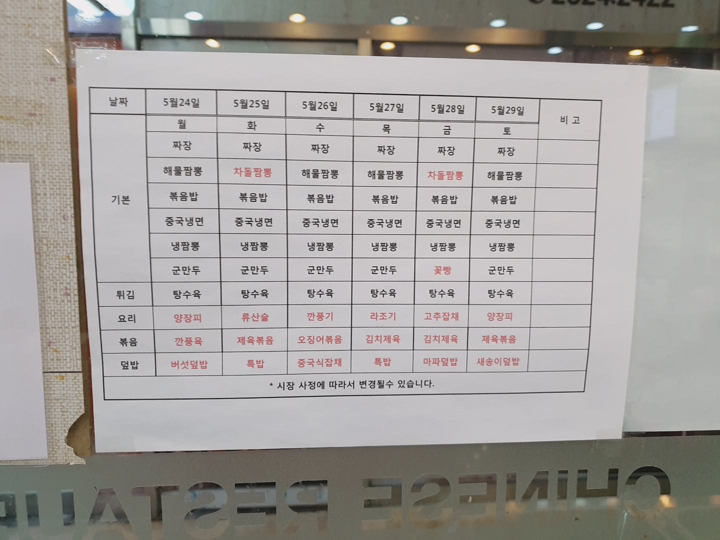 메뉴는 매일 다르게 나온다. 기본 음식(탕수육, 짜장면, 짬뽕 등)은 동일하고 깐풍기, 오징어볶음, 잡채 이런 요리류가 매일 다르다고 한다. 내가 방문한 수요일은 운이 좋게 깐풍기가 나왔다. 참고로 화, 금에는 차돌짬뽕이 나온다고 하니 방문해 보려는 분들은 참고하면 좋을 듯하다.